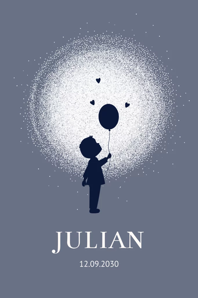 Unieke geboortekaartje met een silhouet van een jongentje met ballon op een blauwe sterren achtergrond en kleine hartjes. Een speciaal geboortekaartje met ronde hoeken. Pas alles naar wens aan.