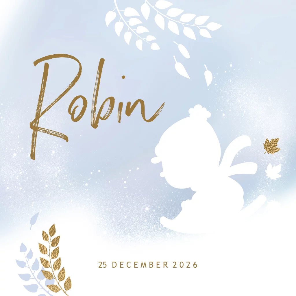 Wordt je zoontje in de winter geboren? Ontwerp dit geboortekaartje met een silhouet van een vrolijk jongetje dat aan het sleeën is in de sneeuw. Met een licht blauw met witte aquarel waterverf look ondergrond. En rondom sierlijke takjes en blaadjes.