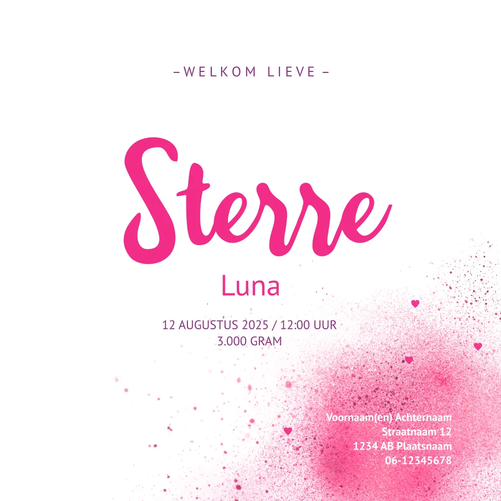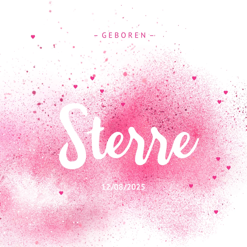 Feestelijk geboortekaartje voor een meisje met mooie frisse roze verf spetters als sterrenstof die lijken op een sterrenhemel en kleine hartjes en groot de naam van jullie nieuwe aanwinst op de voorkant. Hip en trendy geboortekaartje van Luckz die je zelf kan personaliseren.