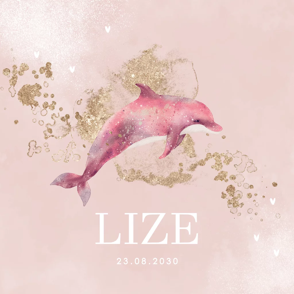 Dit stijlvolle geboortekaartje voor een meisje heeft een prachtige waterverf illustratie van een roze dolfijn met goudlook water spetters, en groot de naam van jullie kleintje eronder. Perfect voor liefhebbers van dolfijnen en een chique uitstraling. (geen goudinkt)