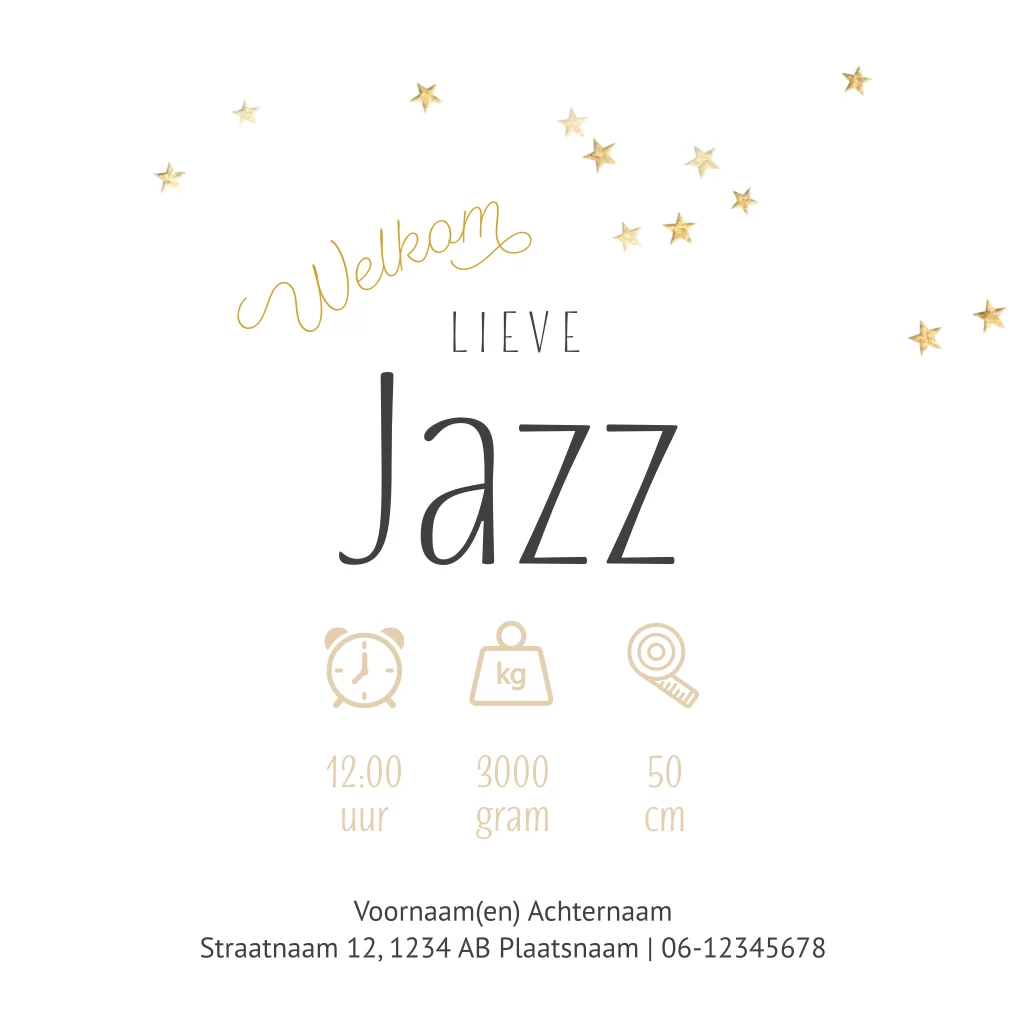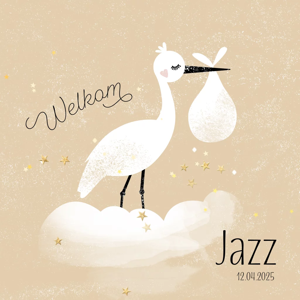 Dit geboortekaartje heeft een leuke illustratie van een witte ooievaar die in een wolkje staat. Met rondom gouden sterretjes.