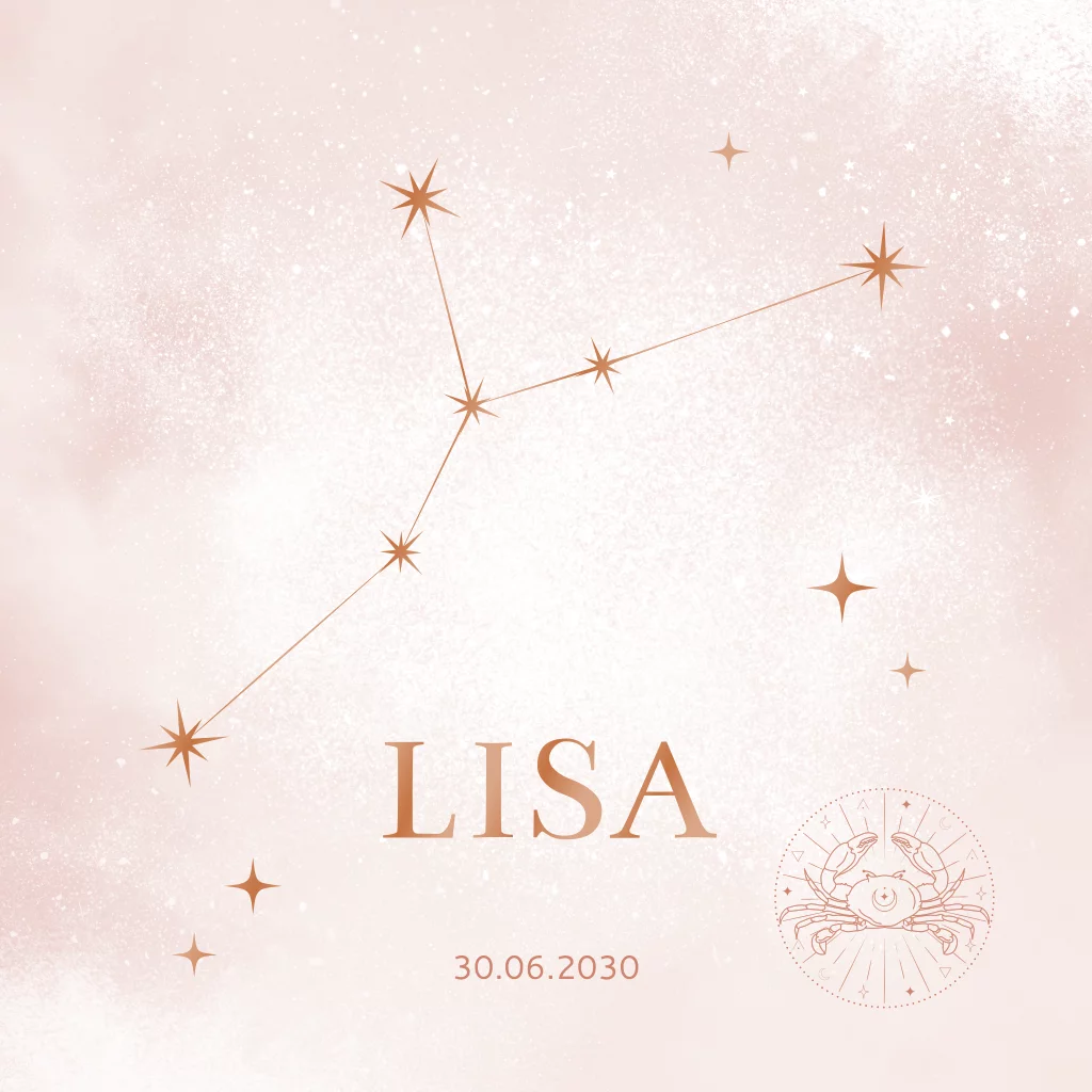 Dit mooie geboortekaartje met het Kreeft sterrenbeeld is perfect voor een meisje dat verwacht wordt tussen 22 juni en 23 juli. Het ontwerp heeft een hemel vol sterretjes op een zachte roze achtergrond. De naam van jullie baby en het sterrenbeeld worden prominent weergegeven in luxe hoogglans op de voorkant van het geboortekaartje. Alles kun je zelf eenvoudig personaliseren.