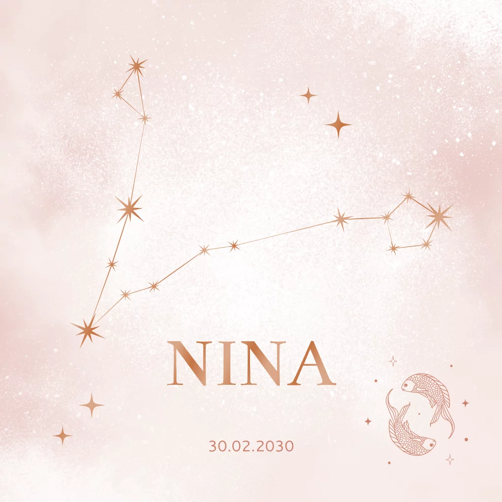Maak dit mooie geboortekaartje met het sterrenbeeld Vissen speciaal voor een meisje. Het ontwerp is elegant met een hemel vol sterretjes op een prachtige roze achtergrond, inclusief de naam van jullie baby en het sterrenbeeld in unieke hoogglans kleur.