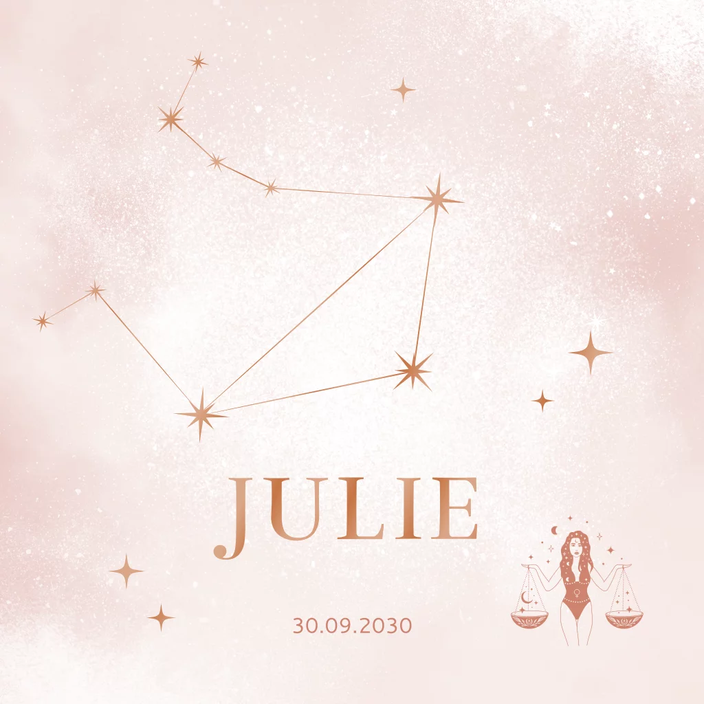 Dit schitterende geboortekaartje is perfect voor de geboorte van een meisje geboren tussen 24 september en 23 oktober, met het sterrenbeeld Weegschaal. Het design heeft een mooie roze achtergrond met een hemel vol sterretjes. De naam van jullie baby en het sterrenbeeld zijn schitterend gedrukt in prachtig hoogglans aan de voorzijde van het geboortekaartje.