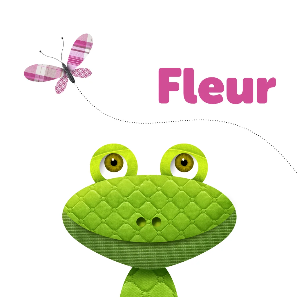 Dit geboortekaartje heeft op de voorkant een leuke groene kikker, een lief vlindertje en de naam van de pasgeboren dochter in het fel roze.