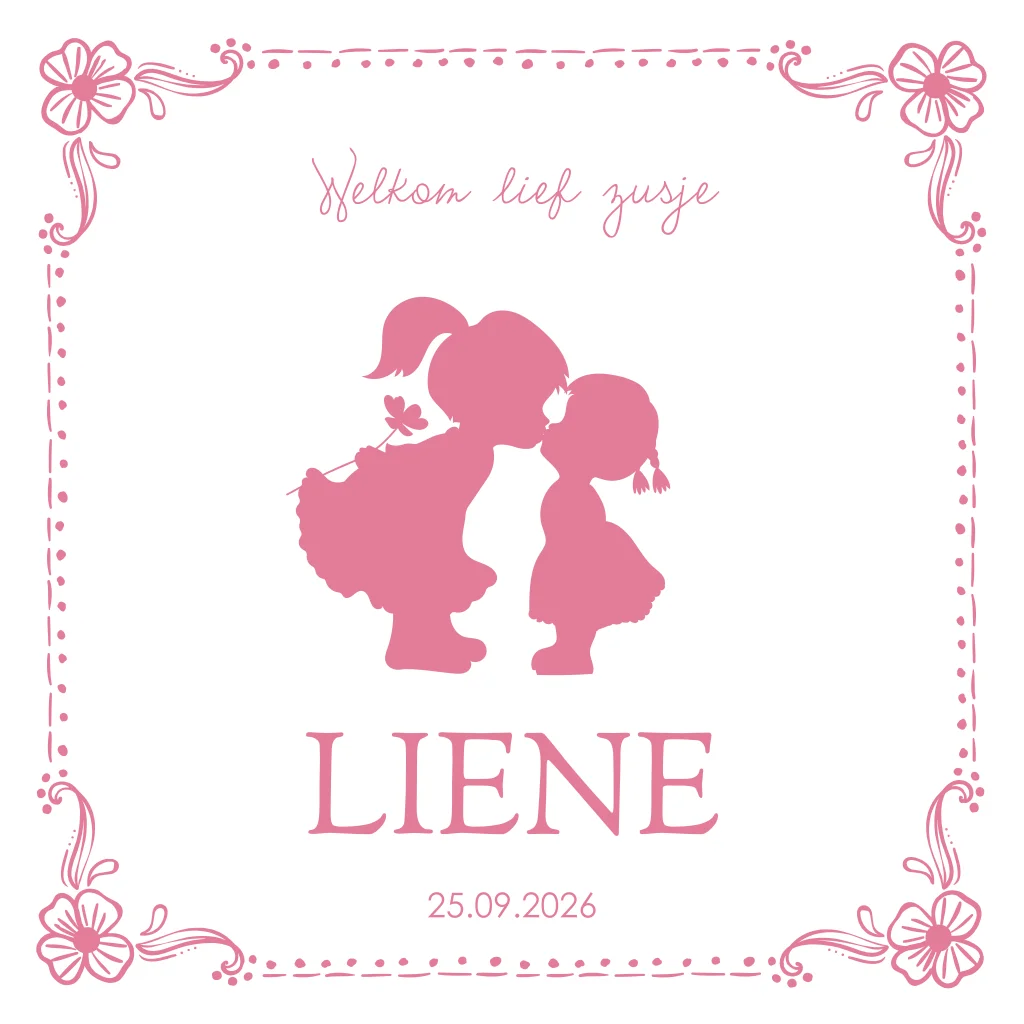 Lief geboortekaartje met silhouetten van een grote zus die haar kleine zusje een kusje geeft. Met hippe roze ornamenten en roze silhouetten van de meisjes op een witte ondergrond.