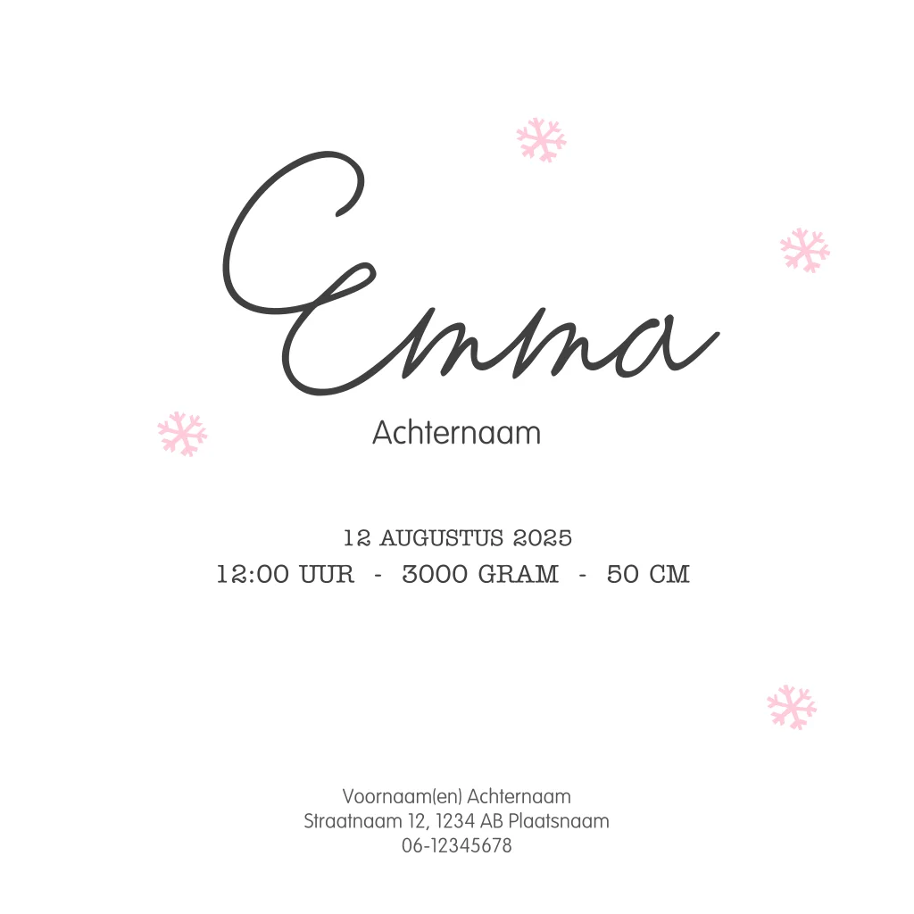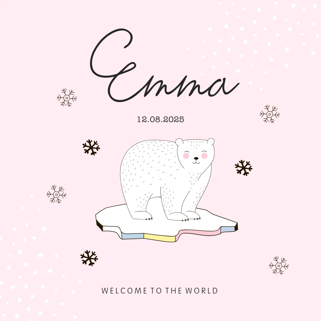 Een lief geboortekaartje met een schattige witte ijsbeer op de voorkant voor je pasgeboren meisje. Met een lieve illustratie van een schattig ijsbeertje die op een ijsschots staat, rondom kleine sneeuwvlokjes en groot de naam van de baby op de voorkant.