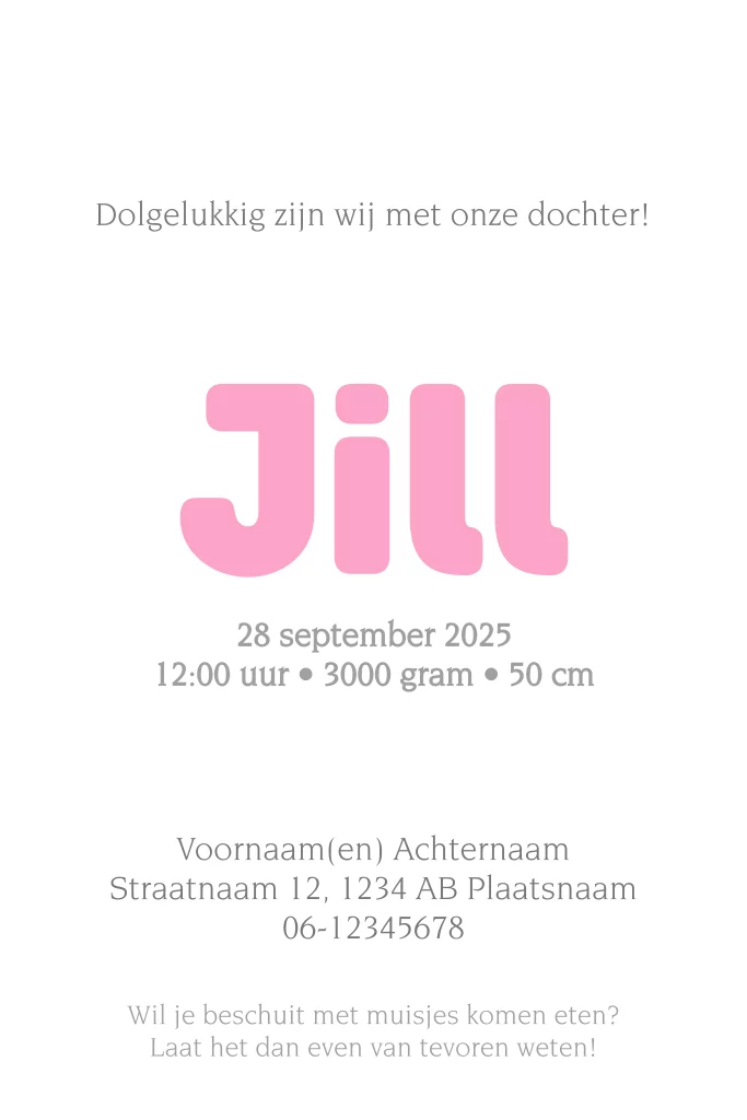 Jullie prachtige meisje is bijna geboren, laat het iedereen horen! Maak dit leuke geboortekaartje en nodig iedereen uit om de kleine parel te bewonderen.
