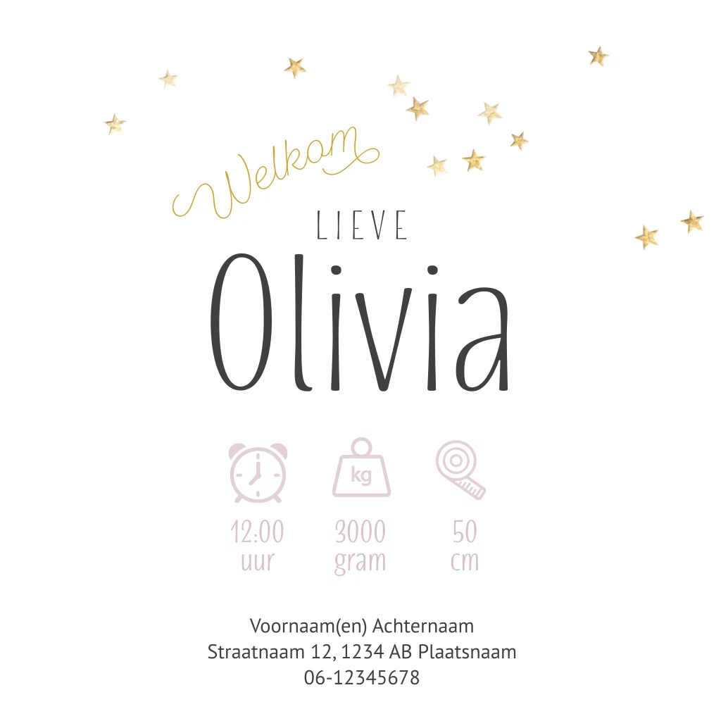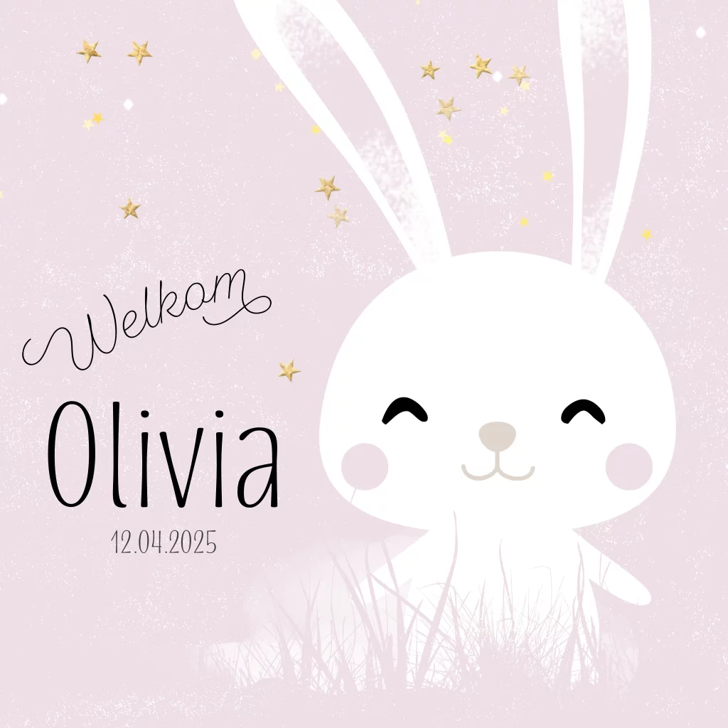 Met roze achtergrond een lief wit konijn en kleine sterretjes met goud look. Alles op dit babykaartje kun je zelf personaliseren.