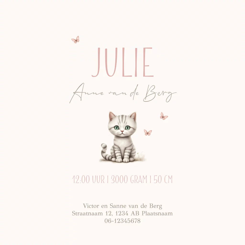 Maak dit lieve geboortekaart voor een meisje met een schattig klein katje en vlindertjes met een ecru neutrale achtergrond. Alles op dit geboortekaartje kun je eenvoudig personaliseren bij Luckz.