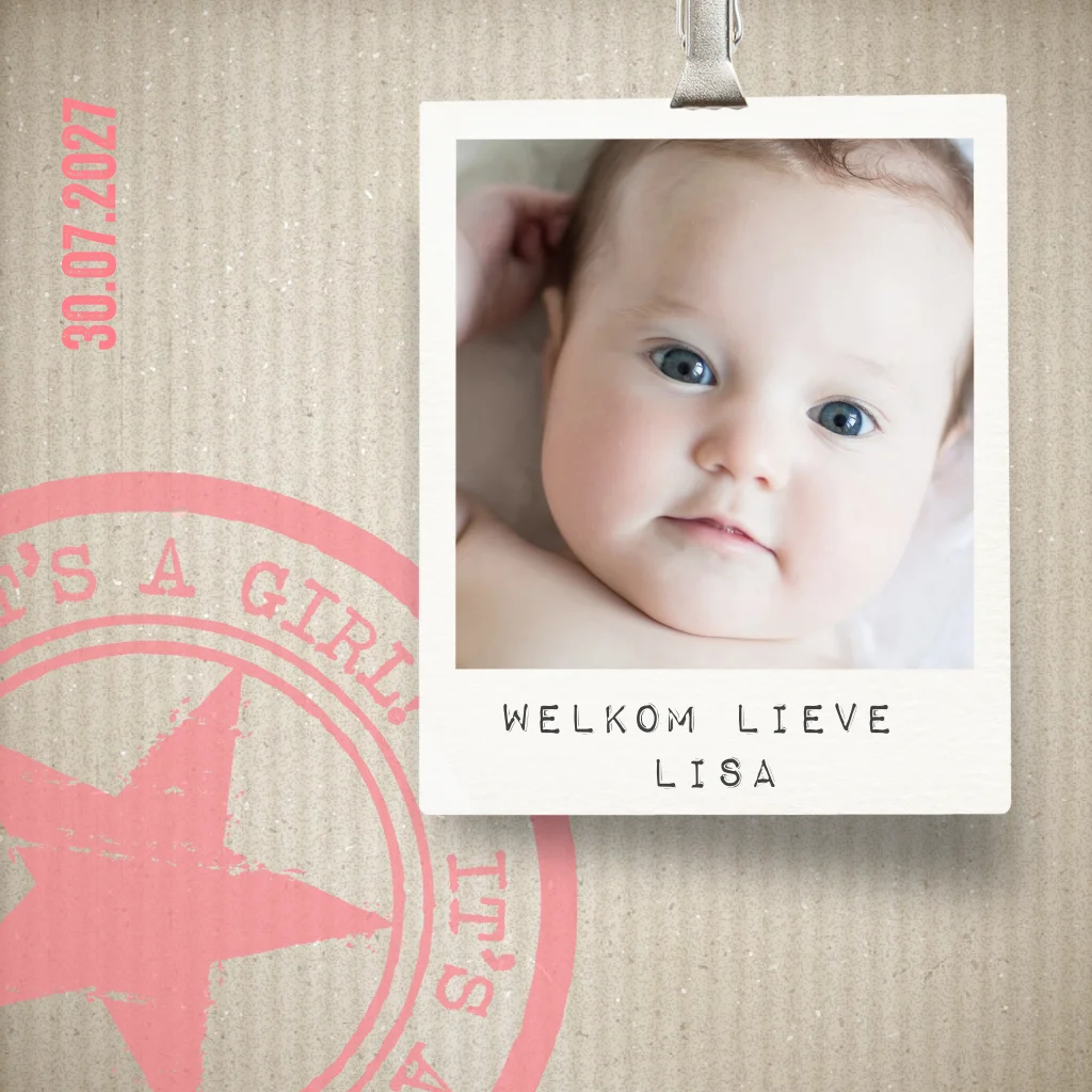 Hip geboortekaartje voor een meisje met foto van de pasgeboren baby op de voorkant, met mooie roze stempel en een kraftpapier look op de achtergrond.