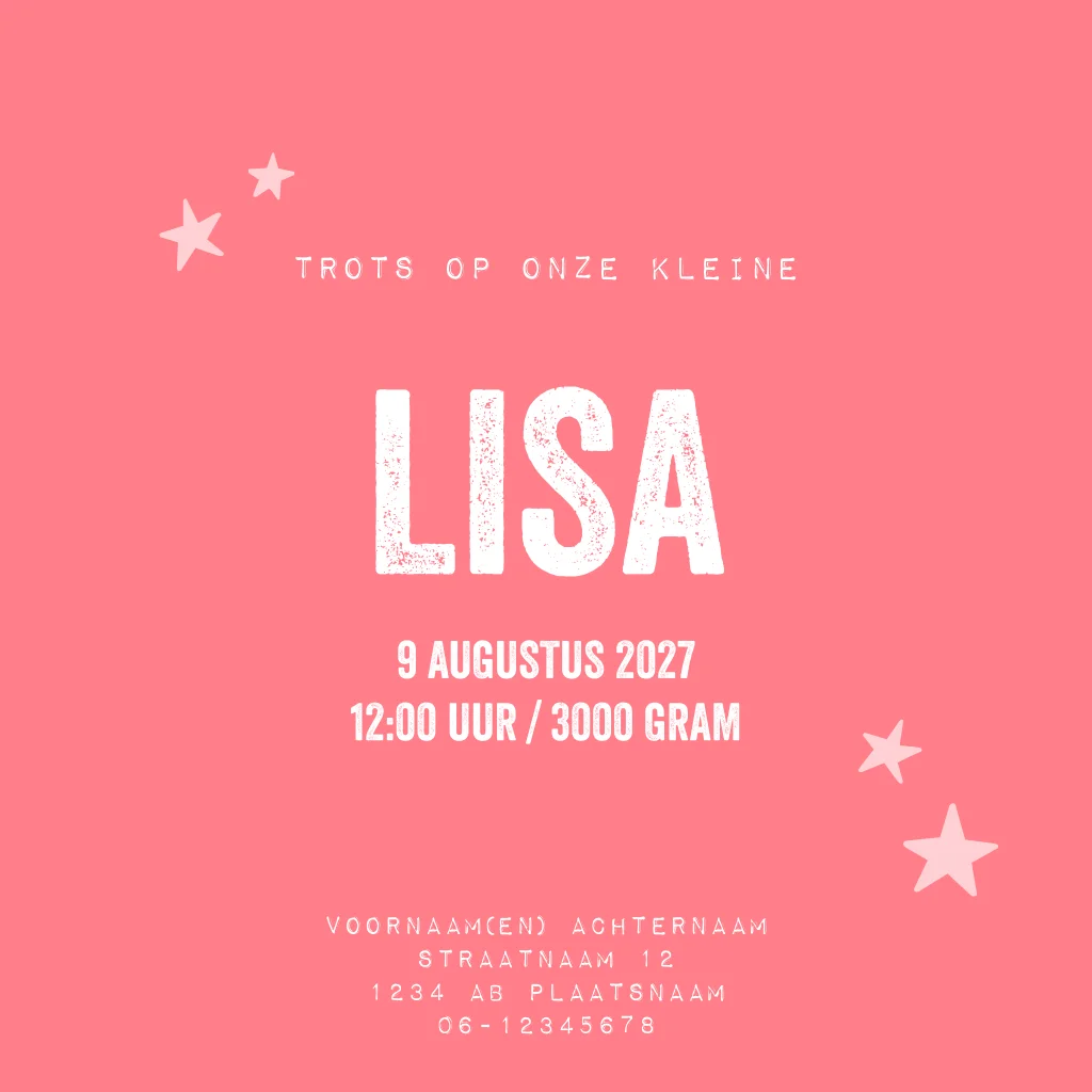 Ontwerp zelf dit stoere geboortekaartje voor een meisje met eigen geboorte foto, kleuren en teksten met de editor bij Luckz.