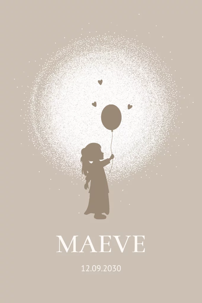 Maak dit mooie geboortekaartje voor een meisje met een schattig silhouet van een meisje met een ballon op een beige achtergrond met sterren. De afgeronde hoeken voegen een speelse touch toe en maken het geboortekaartje helemaal af.