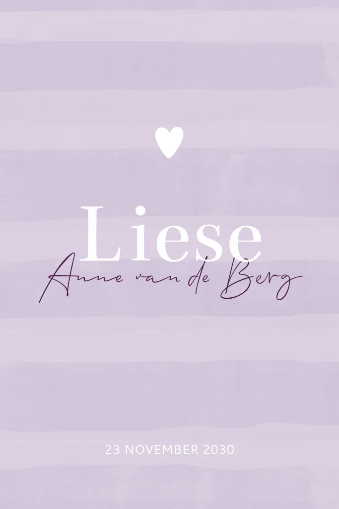 Een vrolijk geboortekaartje met hippe strepen in lila en paars, extra speciaal door de ronde hoeken. Pas alles zoals de kleuren aan naar wens, zet de naam van je dochtertje erop en ontwerp je eigen unieke geboortekaartje voor je meisje.