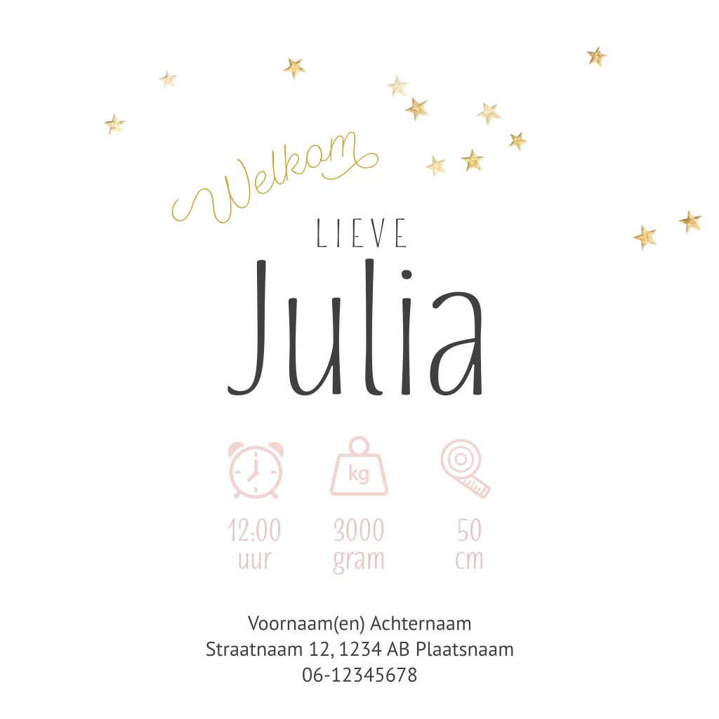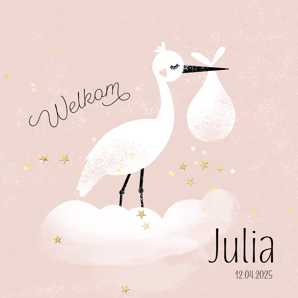 Schattig, origineel geboortekaartje van een ooievaar op een wolk. Met sterren en de tekst welkom. Met mooie roze kleuren en waterverf illustratie.
