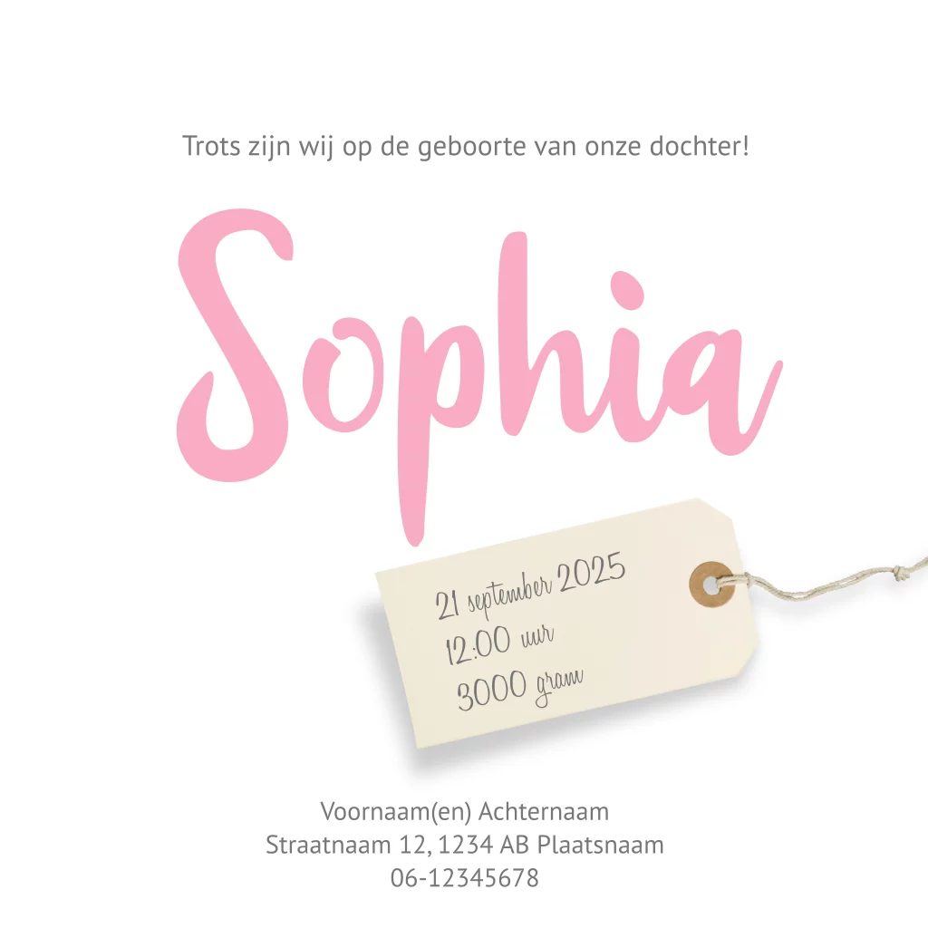 Lief en stoer geboortekaartje voor een meisje, karton met roze tinten en labeltje.