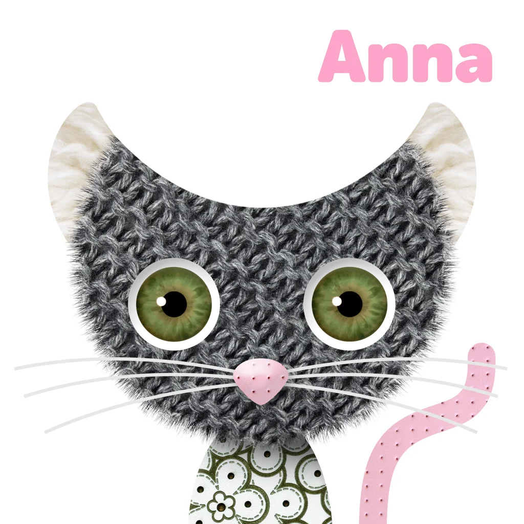Een lief katje met een grijs blauw spijkerstof hoofdje. Het heeft een roze staartje en prachtige groene ogen. Links boven komt de naam van je dochtertje dik gedrukt.