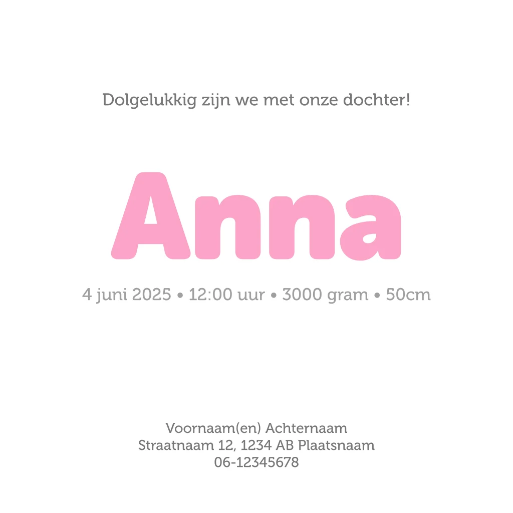 Aan de rechter binnenkant is er plaats voor details en geboortetekst over de pas geboren kleine. Alles is gemakkelijk aanpasbaar, zo maak je zelf deze lieve geboortekaartjes voor een meisje met een katje.