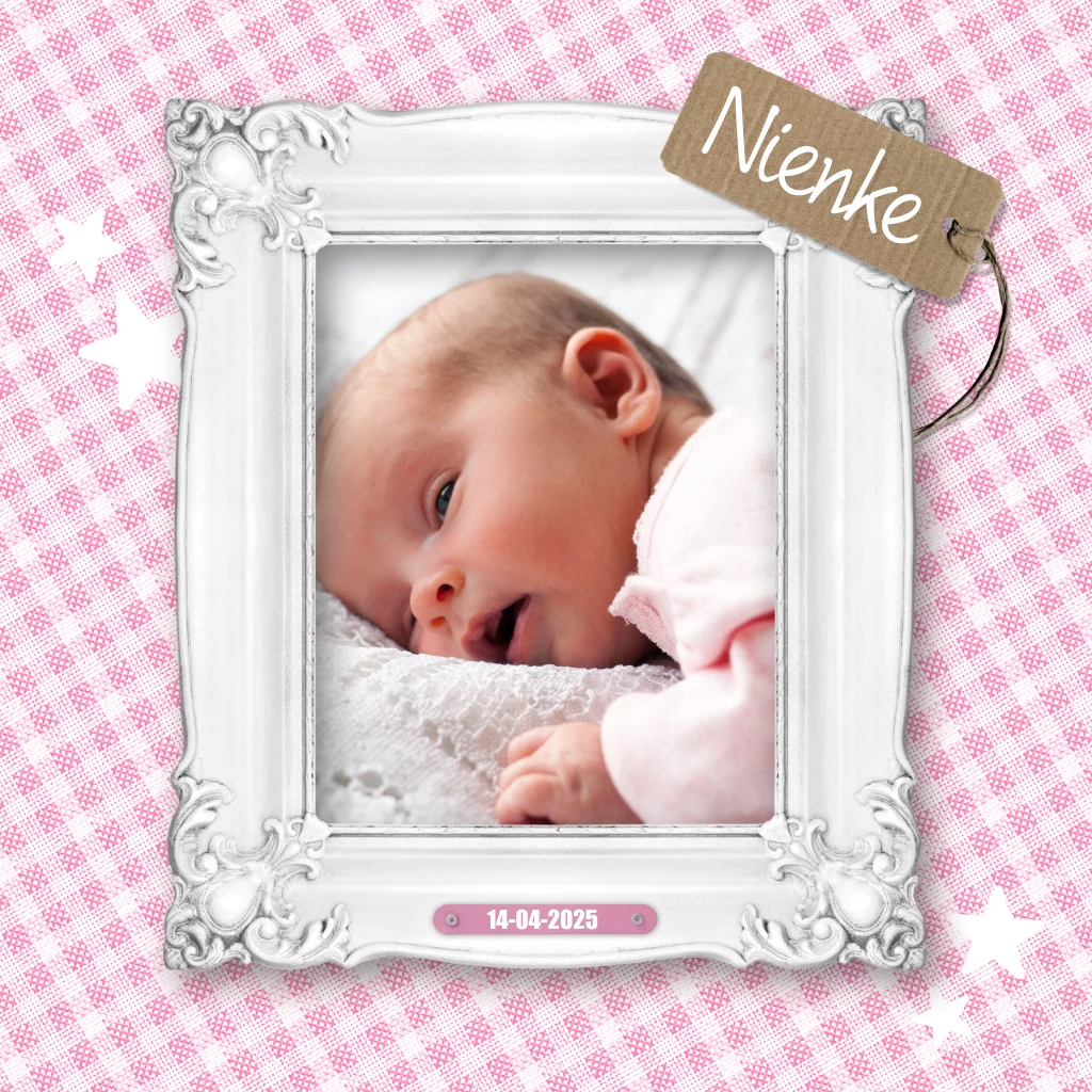 Een lief en schattig geboortekaartje met roze ruitjes en een omlijste foto van jullie kleine pasgeboren meisje op de voorkant.