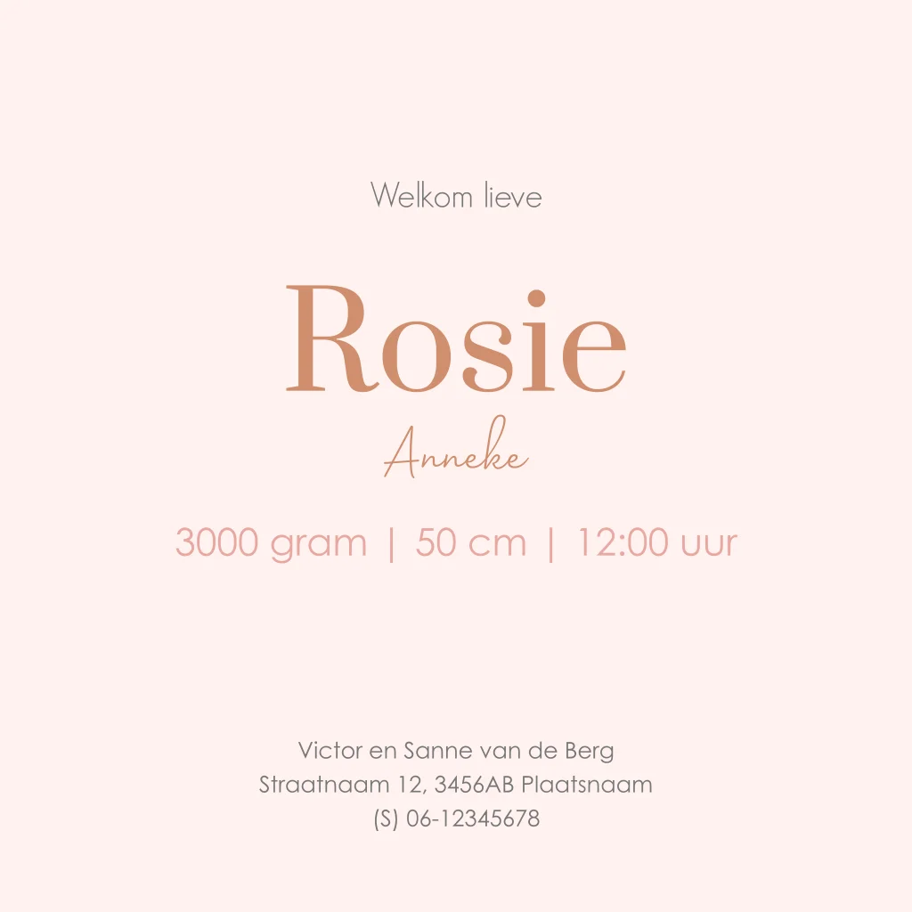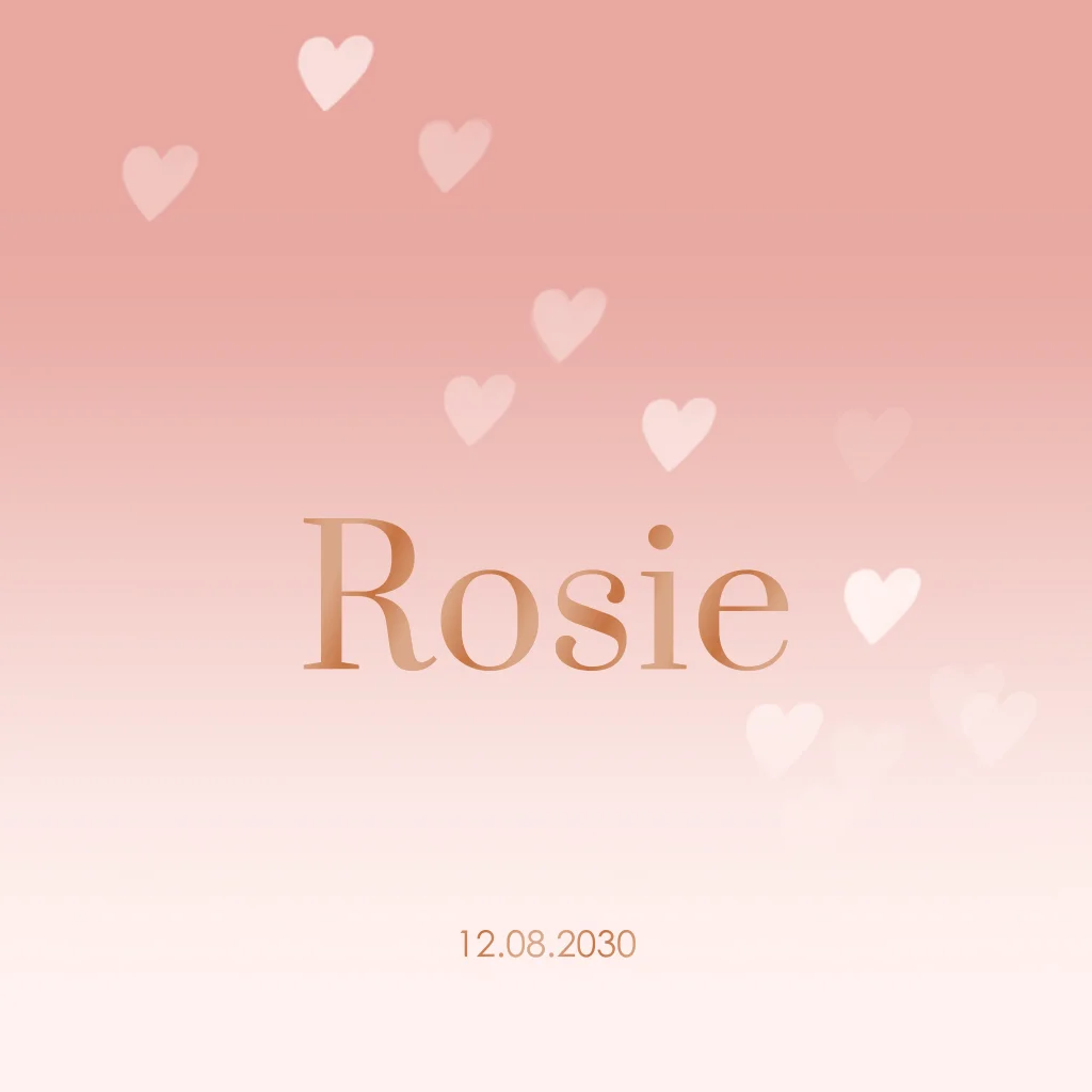 Maak de aankondiging van jullie dochtertje extra speciaal met dit minimalistische geboortekaartje voor een meisje. Met lieve hartjes en een opvallende naam in koper hoogglans, wordt dit kaartje een echte blikvanger. Pas gemakkelijk zelf de naam en kleuren aan, zodat het geboortekaartje perfect past bij je stijl.