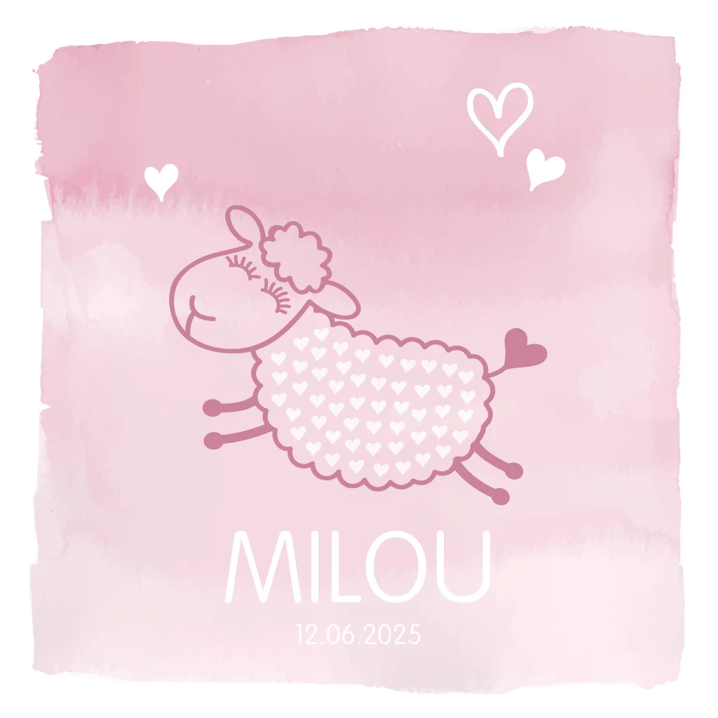 Verander zelf de kleuren van het schaap en de roze pastel achtergrond, schrijf lieve teksten en ontwerp je eigen geboortekaartje bij Luckz.