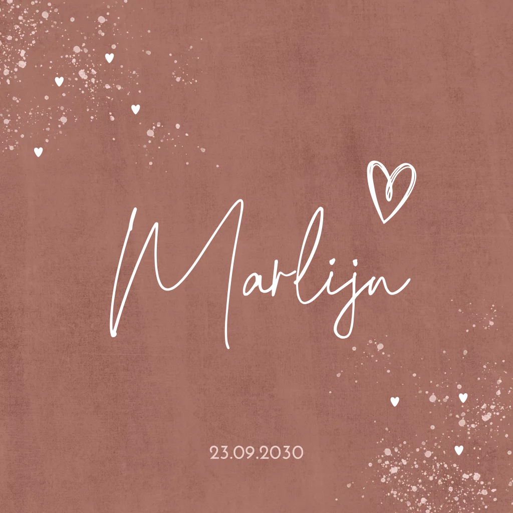 Wat een mooi geboortekaartje voor een meisje, waar groot de naam met een hartje in luxe rosé folie glinsteren op een zachte roest bruin met taupe ondergrond. Omringd door trendy verfspetters, is dit geboortekaartje helemaal aan te passen naar jullie smaak, alles kun je eenvoudig personaliseren in de handige online-editor bij Luckz. .