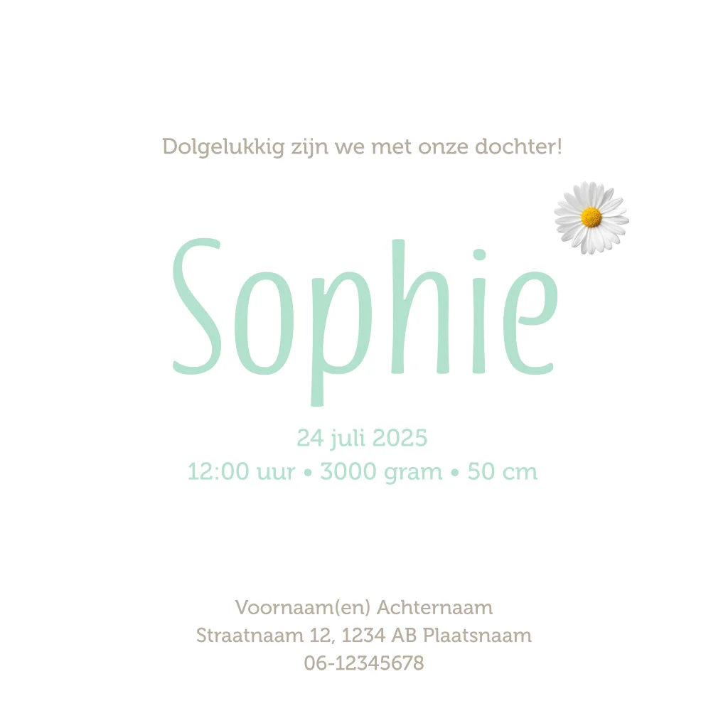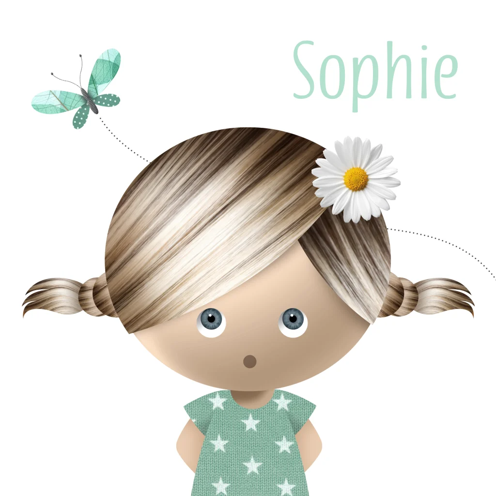 Aan de binnenzijde van het geboortekaartje staat het vrolijke meisje samen met een vlindertje en is er plaats voor een lief geboortegedichtje. Aan de rechterkant van de kaart staat haar naam in het groot, hier is ook ruimte voor geboorte informatie over de kleine meid.