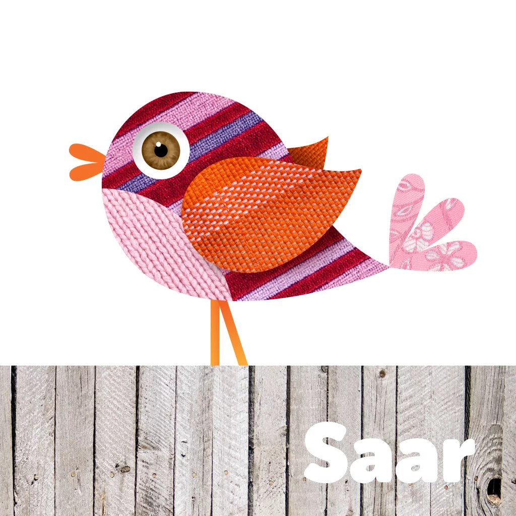 Hip geboortekaartje met een vogeltje op een houten schutting voor een meisje. Leuk geboortekaartje van Luckz.