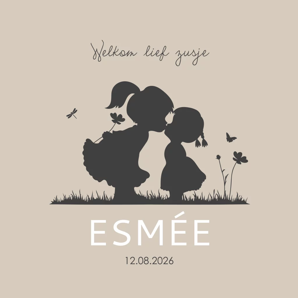 Wat leuk nog een meisje erbij! Laat zien hoe blij jullie zijn met dit lieve geboortekaartje met silhouetten van een grote zus die haar kleine zusje een kusje geeft.