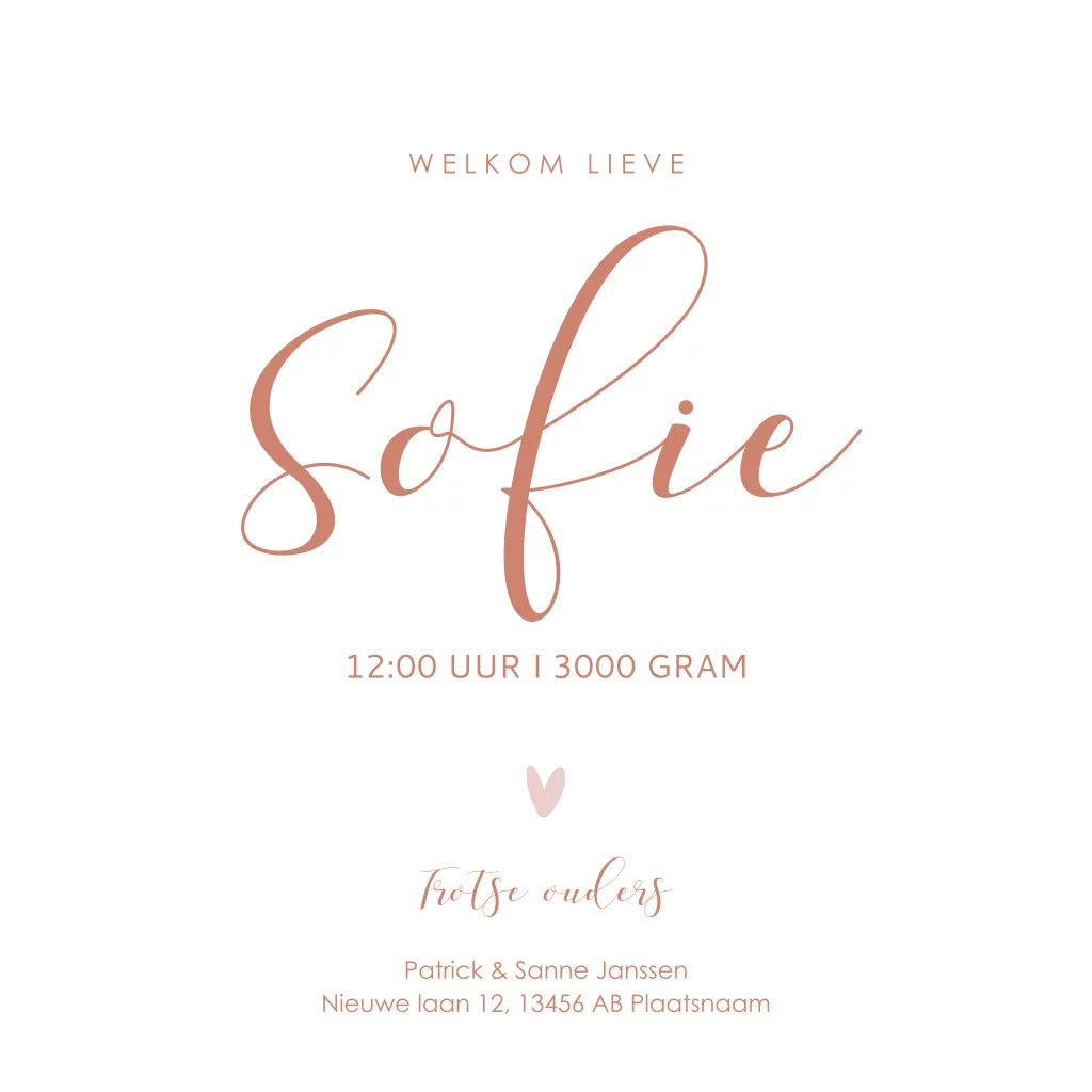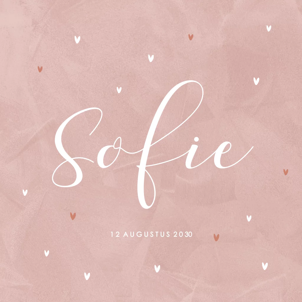 Maak dit hippe geboortekaartje voor een meisje, waarbij de zachte oudroze velvet achtergrond perfect samengaat met de subtiele roséfolie hartjes en groot in wit naam van jullie dochtertje. Een hip en schattig geboortekaartjes ontwerp om de komst van jullie kleine meisje te vieren.