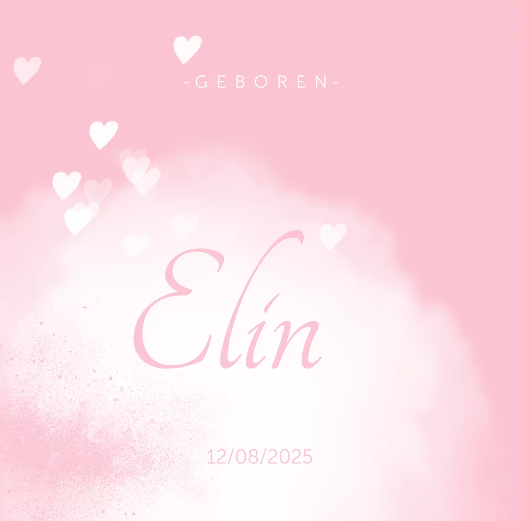 Roze geboortekaartje met hartjes voor een meisje. Met een lieve roze achtergrond en witte wolk effecten.