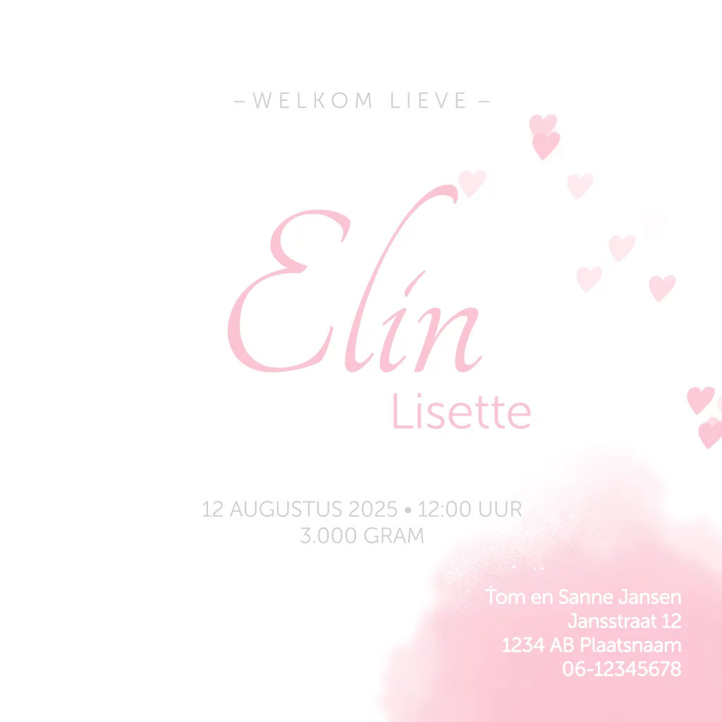 Hip roze geboortekaartje met hartjes die je zelf kan personaliseren bij Luckz.