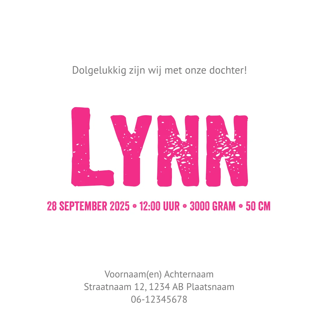 Echt hip! Zo'n zwarte spijkerstof jeans look op de achtergrond van je geboortekaartjes, met daarop de naam en geboortedatum van de nieuwe aanwinst. Met grappig fel roze xxxxs labeltje. Aan de binnenkant van het babykaartje staat een leuke ster waarop je het geboortegedichtje kan schrijven. Aan de rechterkant staan de naam, gewicht en andere details. Pas alle teksten aan naar smaak en ontwerp je eigen stoere geboortekaartjes bij Luckz..