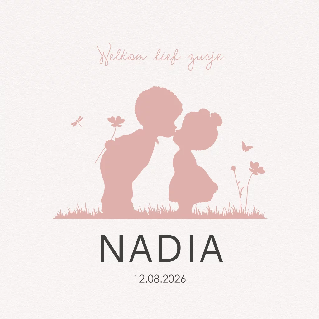 Wat een schattig geboortekaartje! Met hippe silhouetten in lichte oudroze kleuren. De twee kleintjes staan in het gras tussen de bloemetjes en vlindertjes.