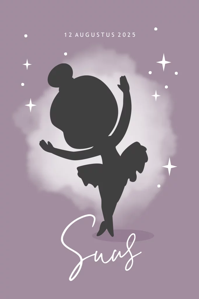 Dit is een lief en schattig geboortekaartje met silhouet van een dansende ballerina meisje met rondom kleine sterretjes. Met een mooie paarse achtergrond en witte en donker grijze silhouet elementen die je allemaal een eigen kleur kan geven met de editor.
