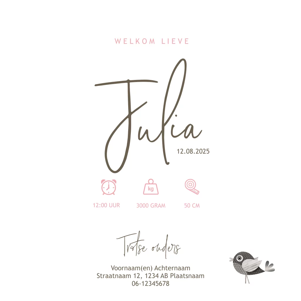 Een lief geboortekaartje voor een dochter met een roze walvisje en een klein vogeltje op zijn hoofd. Het diertje is opgezet met stof patroontjes. Het is mogelijk om naam, tekst en geboorte informatie zelf toe te voegen. Maak zelf een lief en uniek geboortekaartje voor een meisje.