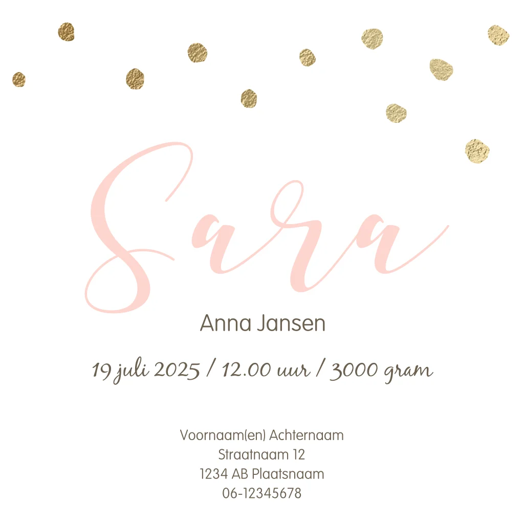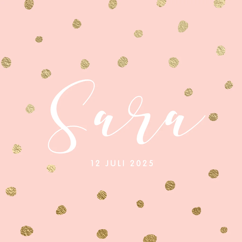 Schattig en lief geboortekaartje voor een meisje met roze achtergrond, chic gouden stippen en stijlvolle typografie.