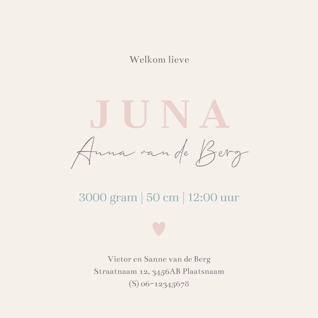 Minimalistisch geboortekaartje voor een meisje met schattige kleine kleuren hartjes en de naam in luxe holografische folie. Dit minimalistische ontwerp straalt eenvoud uit met schattige kleine roze en petrol kleurige hartjes en een vleugje luxe dankzij het holografische folie. Laat je betoveren door de unieke cleane uitstraling van dit geboortekaartje en maak de aankondiging van jullie kleine meisje extra speciaal.
