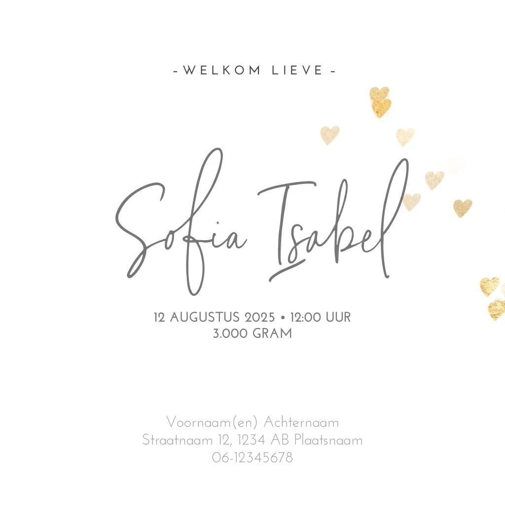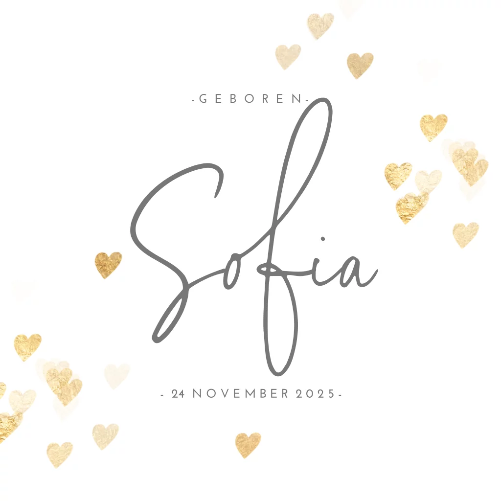 Een mooi minimalistisch geboortekaartje voor een meisje of een jongen met lieve kleine gouden hartjes op een witte achtergrond.
