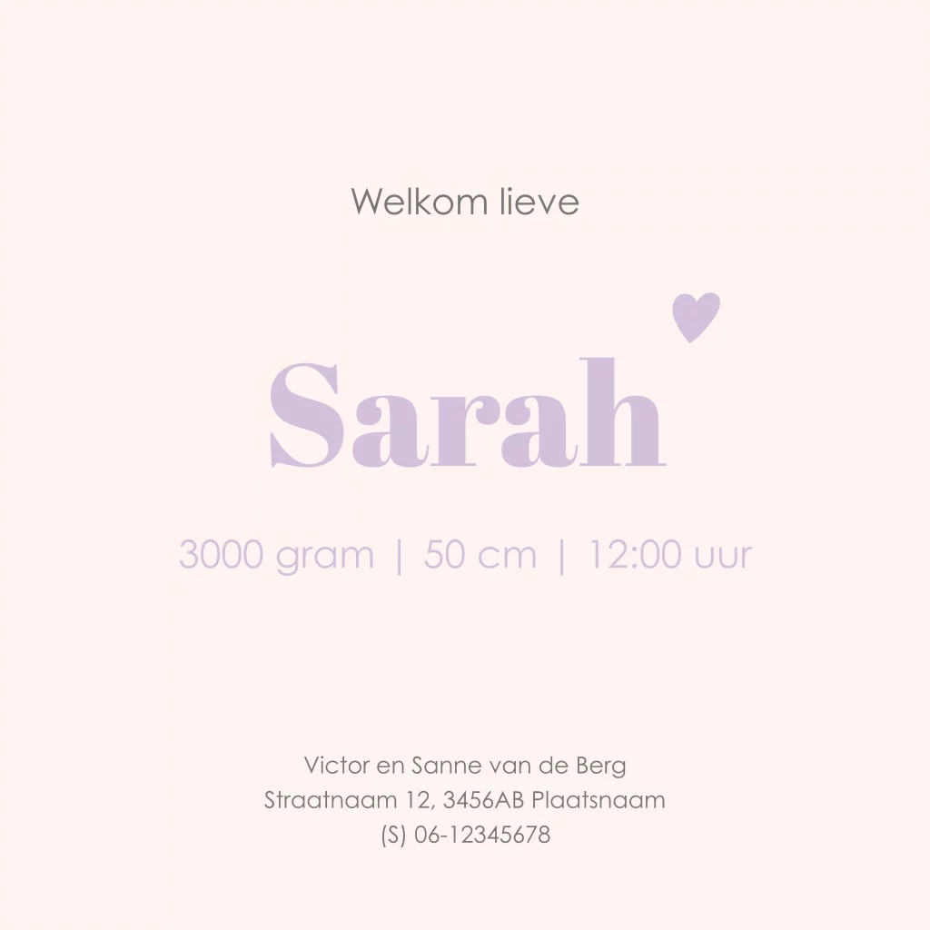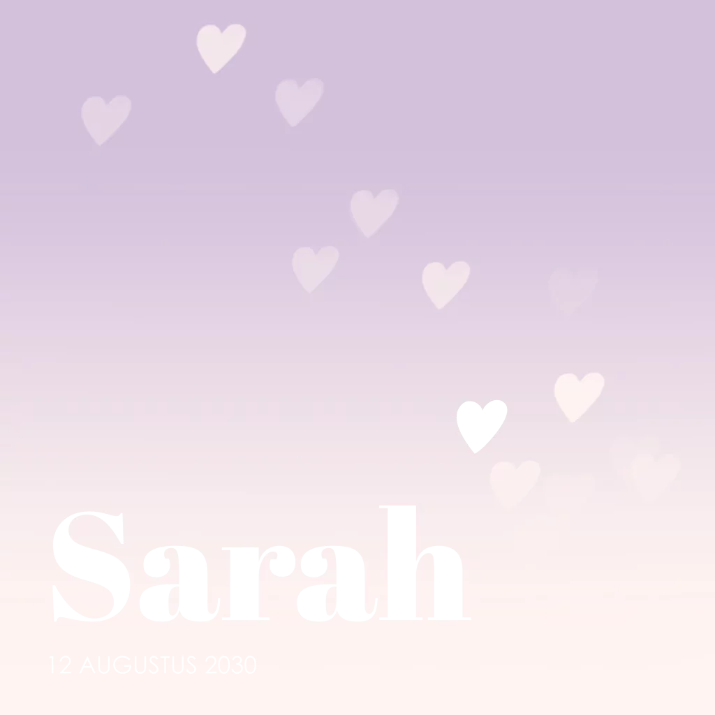 Dit minimalistische geboortekaartje heeft een moderne en elegante uitstraling met een mooi kleurverloop van lila en ecru pasteltinten en schattige hartjes. De naam van jullie dochter wordt prachtig weergegeven in holografisch folie. Met zijn verfijnde en eigentijdse ontwerp is dit geboortekaartje een unieke manier om de geboorte van jullie kleine meisje aan te kondigen.