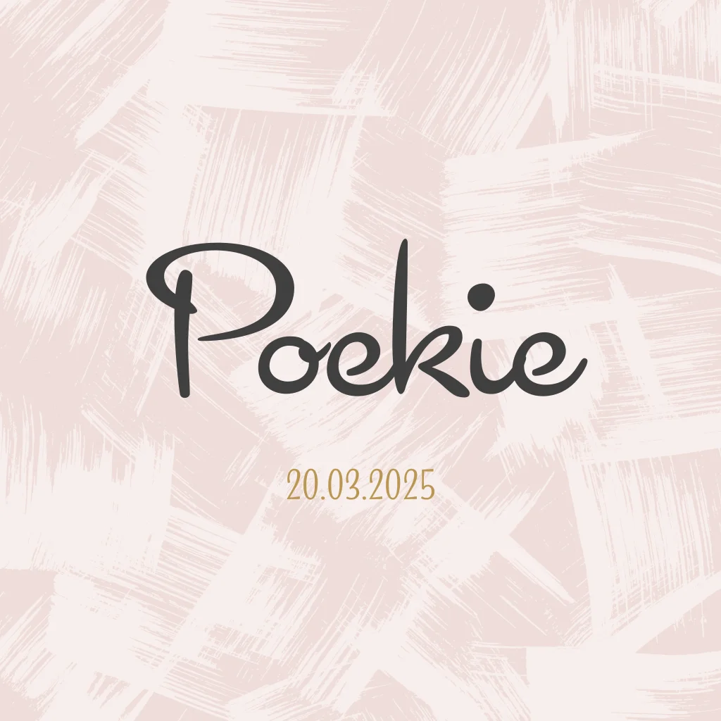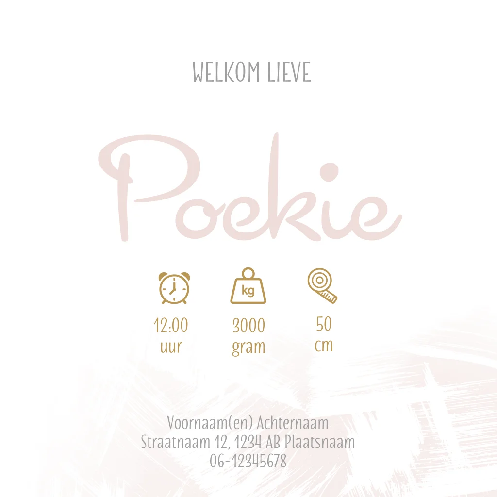 Mooi geboortekaartje voor een meisje met groot de naam in een leuk lettertype met verf streep patroon in licht roze kleuren.