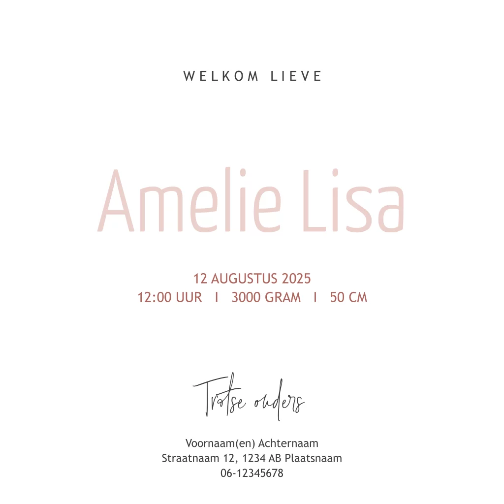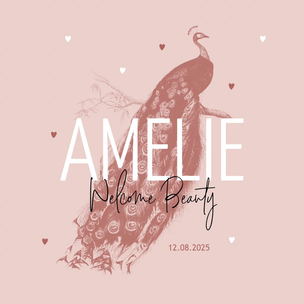 Mooi geboortekaartje met een chique pauw illustratie in donkere en licht roze kleuren. Met daarop in grote witte typografie de naam van jullie dochter op de voorkant. Rondom de mooie vogel en naam staan kleine lieve hartjes.