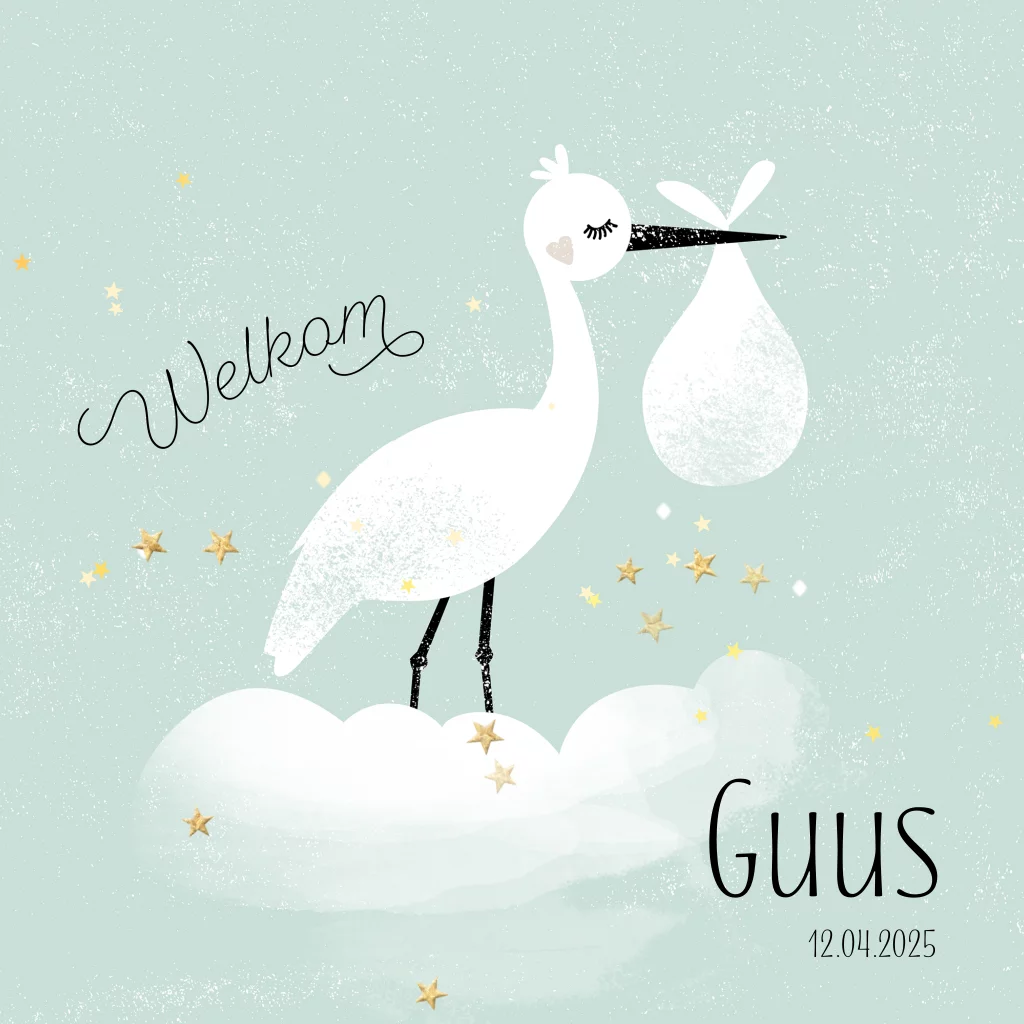Op een mint groene achtergrond kleur staat een lieve witte ooievaar in de wolken met rondom kleine sterretjes. Super cute!