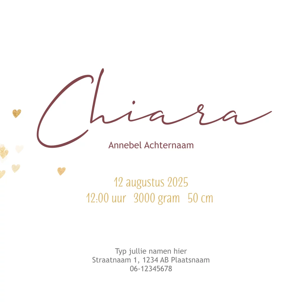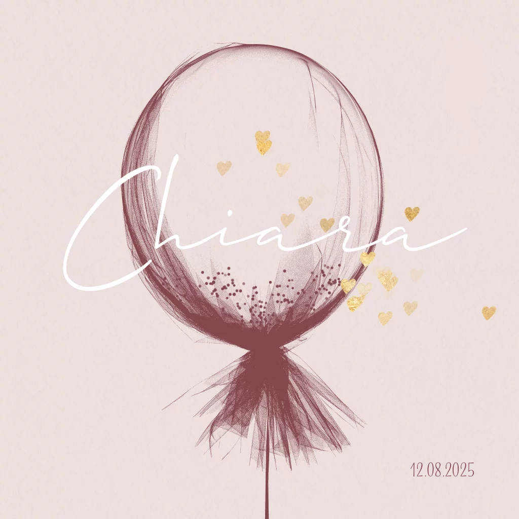 Lief geboortekaartje met een grote donker roze ballon illustratie op een oud roze ondergrond. Rondom de naam van jullie meisje vliegen kleine gouden hartjes.