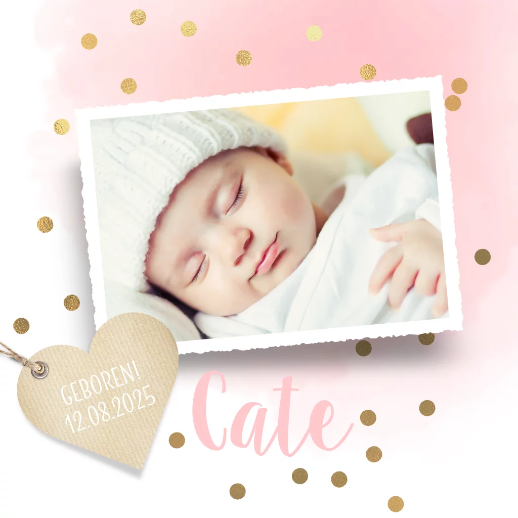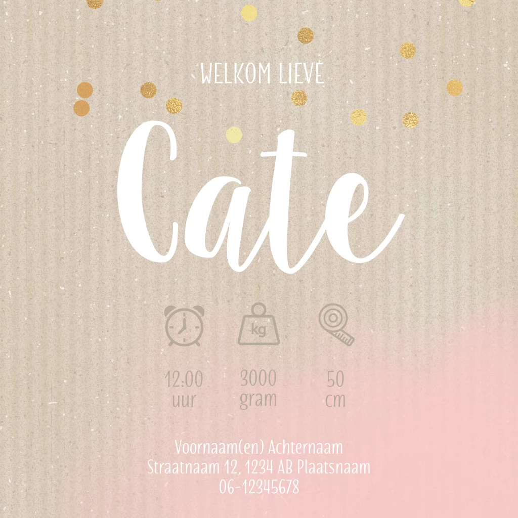 Maak een prachtige foto van jullie pasgeboren prinses en laat haar stralen op de voorkant van het geboortekaartje. Omringt door vrolijke gouden confetti op een zacht pastel roze achtergrond. Laat het iedereen weten: jullie kleine meisje is geboren!