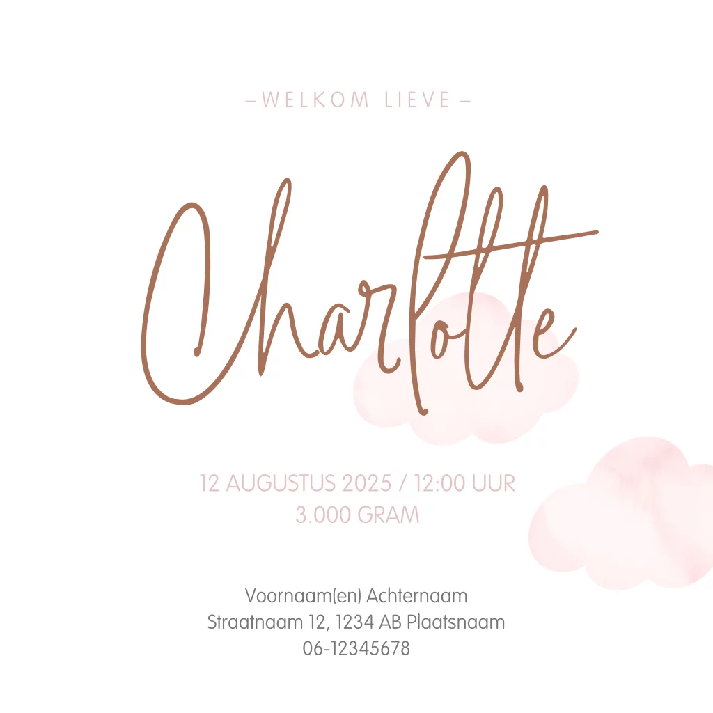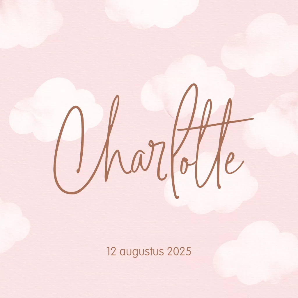 Een lief en dromerig geboortekaartje met lieve aquarel stijl witte wolken op een roze ondergrond. Maak dit schattige babykaartje zelf bij Luckz.