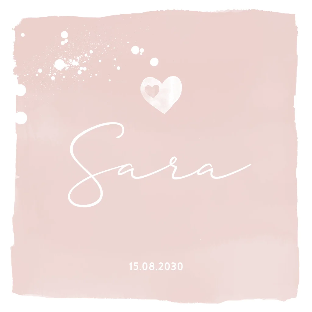 Ontwerp dit lieve roze geboortekaartje, speciaal voor jullie meisje! De pastelroze achtergrond straalt zachtheid uit, terwijl de verfspetters en het hartje het geheel een mooie uitstraling geven. Personaliseer dit prachtige geboortekaartje voor een unieke aankondiging van de geboorte van jullie dochtertje en pas de kleuren, naam, geboortedatum en geboorteteksten aan.