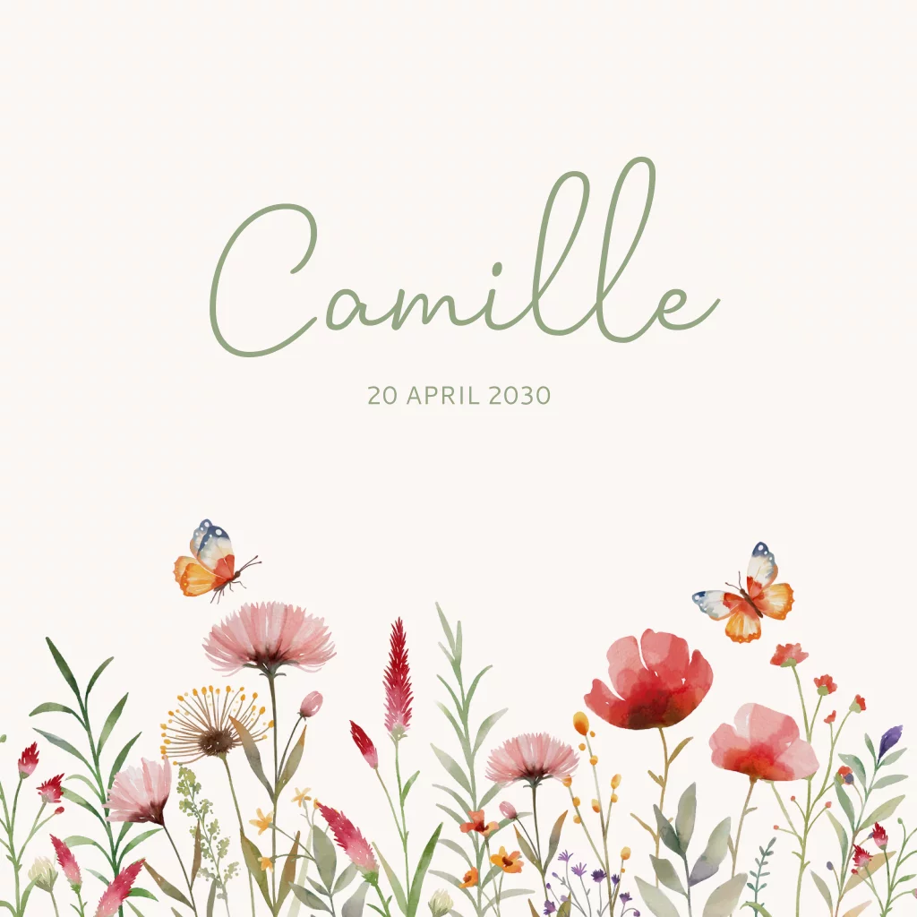 Schattig geboortekaartje voor een meisje met kleurrijke bloemen en vlinders in waterverf stijl.
