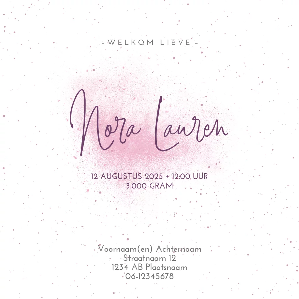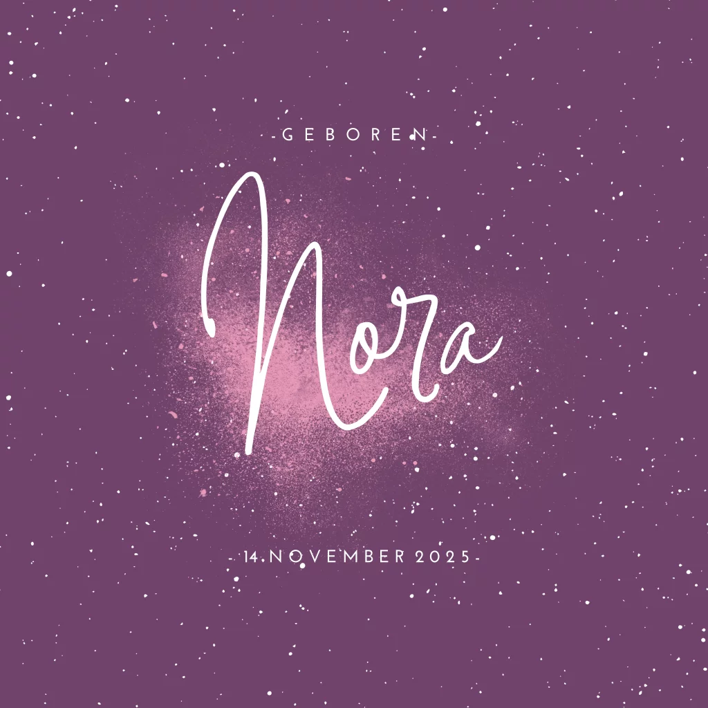Bijzonder geboortekaartje met een heldere sterrenhemel in licht roze en donker paarse tinten. De typografie en het lettertype van de naam kun je zelf sierlijker of stoerder maken en ook alle roze en paarse kleuren en witte teksten kun je zelf helemaal ontwerpen en personaliseren.