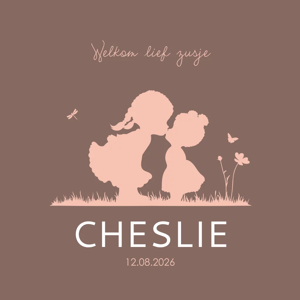Zusjes geboortekaartje met een silhouetten van een grote en kleine zus die elkaar een kusje geven, met lieve krulletjes, vlechtjes en kroeshaar.